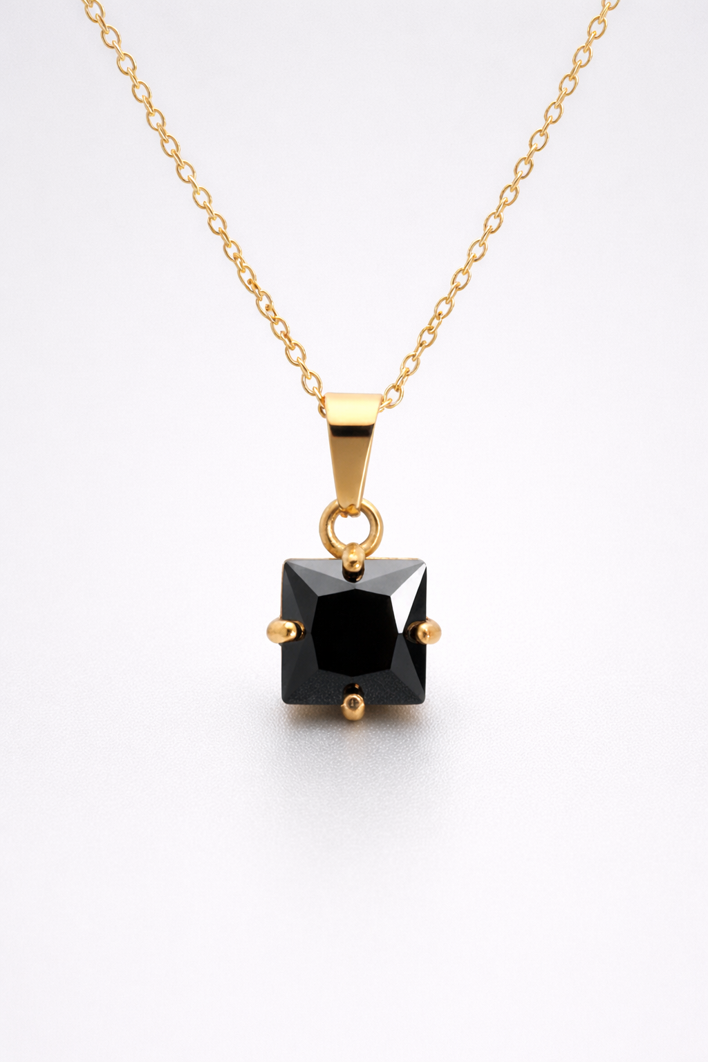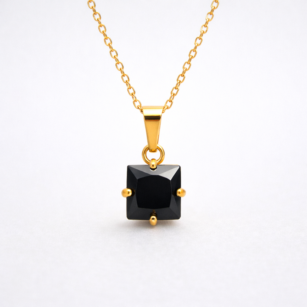 Este collar destaca por su diseño limpio y contemporáneo. La cadena dorada sostiene un colgante cuadrado de circonita, disponible en distintos tonos, que aporta luz y carácter al conjunto.