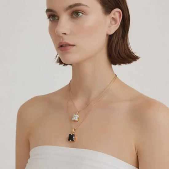 Collar de cadena fina dorado. Colgante cuadrado de circonita, disponible en blanco y negro. Baño de oro 18K.