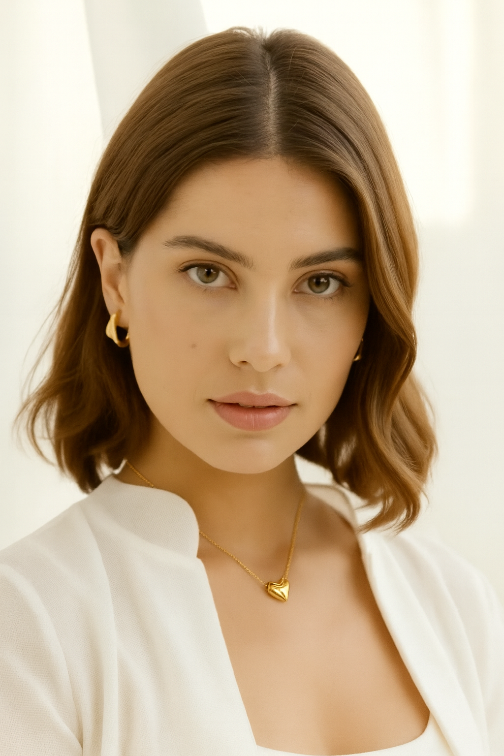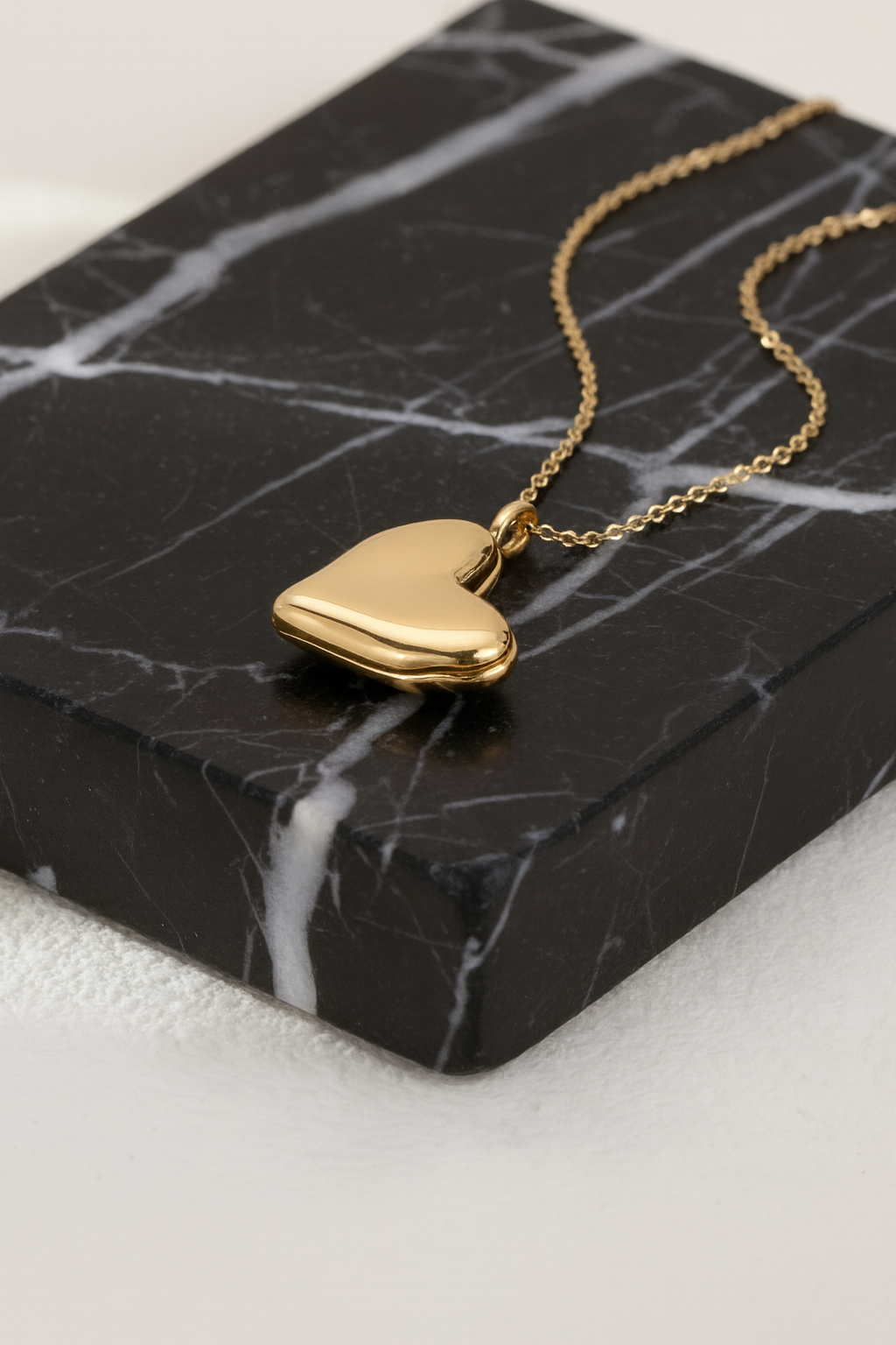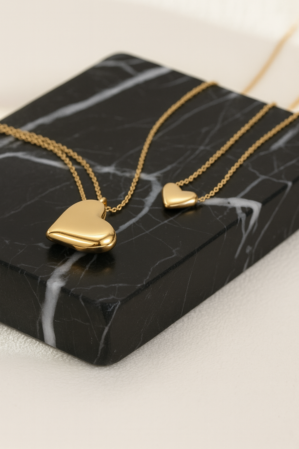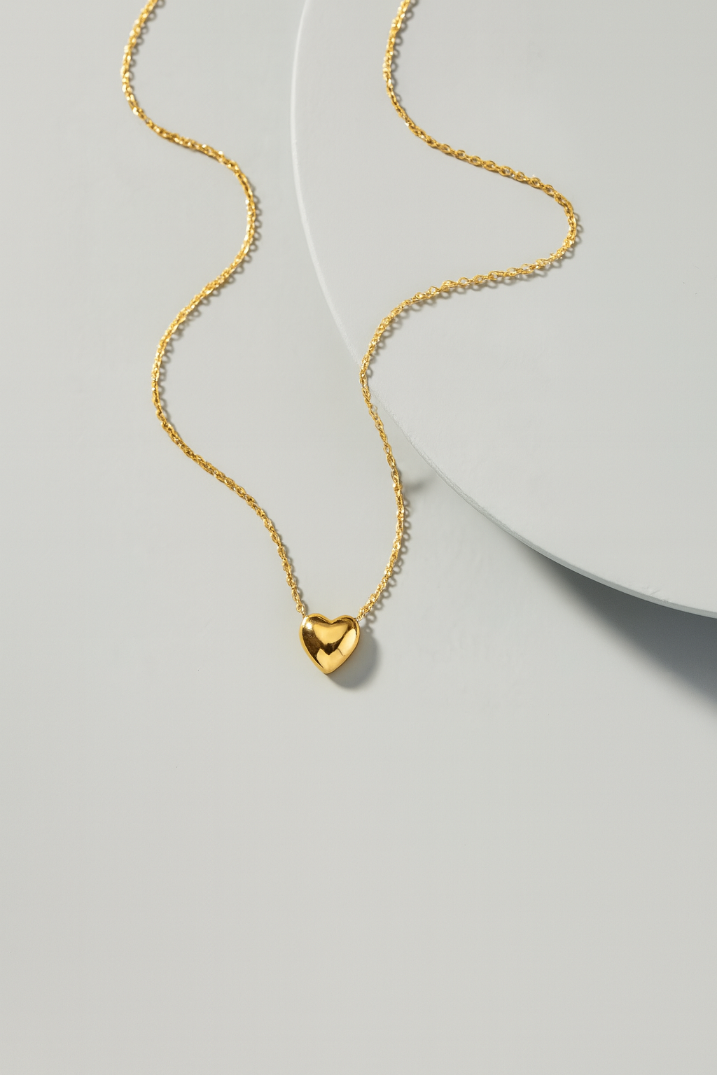 Un collar delicado con colgante de corazón en tamaño mini, diseñado para aportar un gesto suave y luminoso. Su forma pulida y su dimensión discreta lo convierten en una pieza fácil de llevar, perfecta para el día a día o para combinar con otros collares.